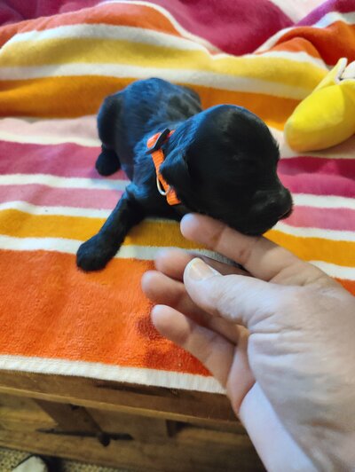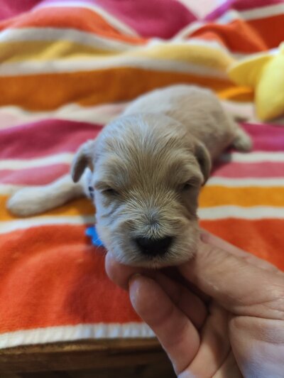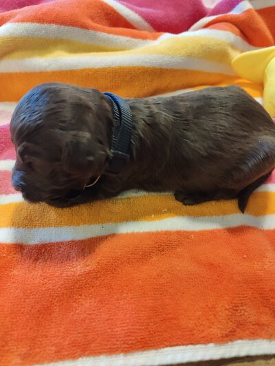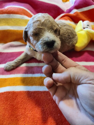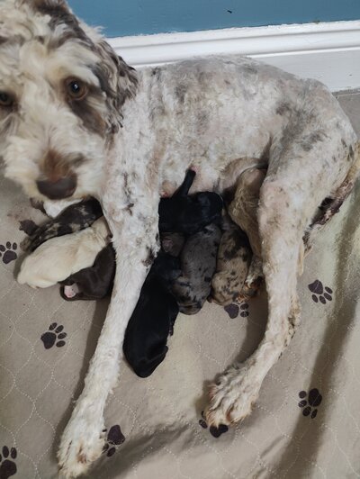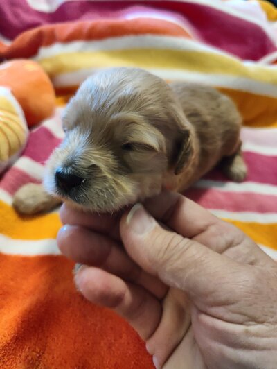 A gentle and loving F1bb Mini Goldendoode has a calm temperament and a nurturing nature, making her an excellent mother. She is intelligent and sociable, always eager to interact with people and other pets. Ella had 9 puppies on March 7th that will be ready May 2nd.