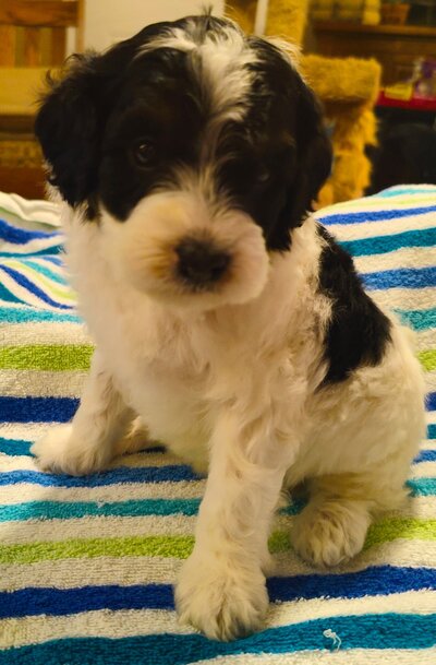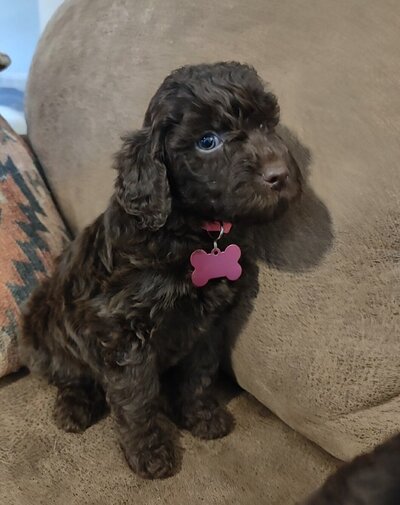 A playful and affectionate F1bb Mini goldendoodle, is known for his sharp intelligence and energetic personality. He brings a vibrant spirit and a loving demeanor to his puppies, ensuring they inherit the best traits from both parents.