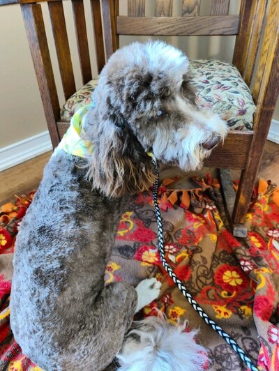 Piper, an F1bb Mini Goldendoode, red merle, has a calm temperament and a nurturing nature, making her an excellent mother..